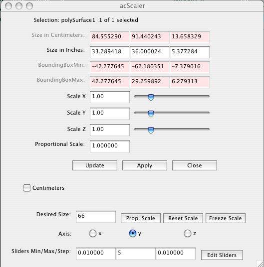 Proportionate scaling dialog box. Desired scaled size in inches or centimeters. Enter desired scaled size in one axis. Other axes scale by same proportion. Shows bounding box information. Object size shown in centimeters and inches. Revised: May 23, 2007 |