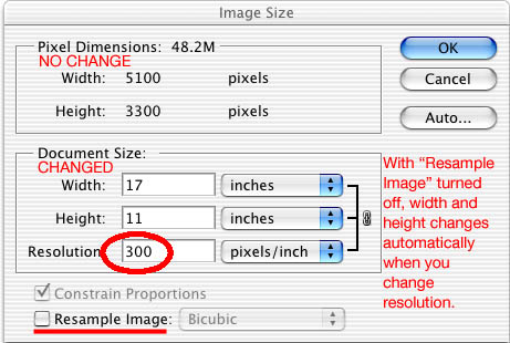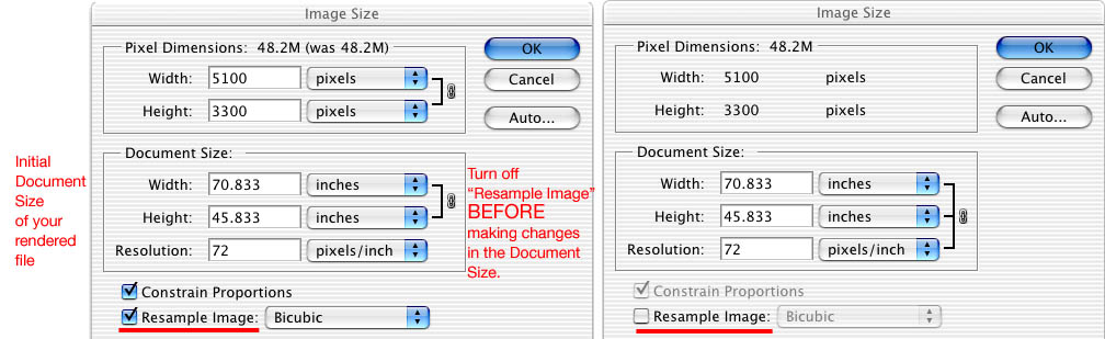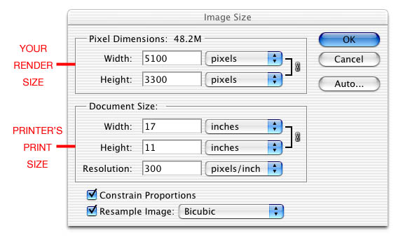Rendering for Print Example: Printer tells you he wants a file 17x11 inches at 300 dpi. Open a new file in Photoshop with the printer's settings. No need to save this file. You're only using it to get your render size. ![]() Go to Image>Image Size. Look at the Pixel Dimensions. Render your file at this size. ![]() After rendering your file, open it in Photoshop. Go to Image>Image Size. The Pixel Dimensions are correct but the Document Size doesn't show what the printer wants yet. TURN OFF "RESAMPLE IMAGE". I'll repeat this because it is the most important thing in all of this: TURN OFF "RESAMPLE IMAGE"!!!! ![]() Now change the Resolution in Document Size to 300 pixels per inch. The size automatically updates to 17x11 while the pixel dimensions remain unchanged. ![]() Click OK. Save your file. Send it to the printer. |