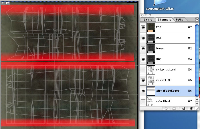 | I temporarily substituted a checkerboard image for one texture so that I could easily see where the two textures overlapped and needed adjusting. |
